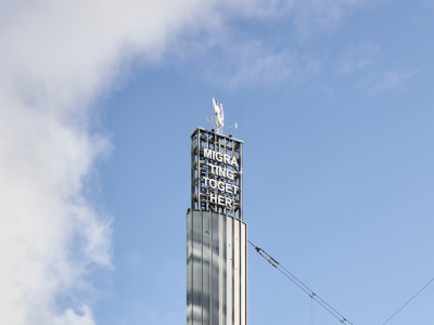 In your own time, tingalong, tingalong, Who’s been here since I’ve been gone? is a sculptural body that turns with the wind atop a monumental tower behind Brussels-South station. This copper weathervane by Laure Prouvost oversees an illuminated sign suggesting that you too can let yourself be carried away by the elements and be more in tune with the directions they are guiding you towards. Trains directly altered our experience of time by introducing synchronised clocks in the stations, which replaced the different local times. Considering the parallel histories of the Industrial Revolution and women’s emancipation movements in the nineteenth century, Prouvost wonders how one can substitute the forces of control that regulate the way we move in the world with softer, more intimate and unpredictable currents. Floating among the clouds, her visionary oracle is a harbinger of a world that privileges multiple viewpoints.