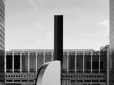 Esprit ouvert (1997) marks the symbolic departure point of the art trail Endless Express. This monumental sculpture is one of the last commissions for public space made by the artist. Presenting itself as a portal or a place of passage, the work expresses Tapta’s enduring interest in spatial interventions relating to bodies moving through the world. The geometric steel arch seemingly opens itself, providing a view onto the built environment; it sits on an elliptical pool of water that captures the reflections of its brilliant surfaces, and dynamically activates them. Esprit ouvert exemplifies the artist’s love of contrasting forms and ideas, never static and always suggesting a transition from one state to another, between opening and closure, distance and rapprochement.