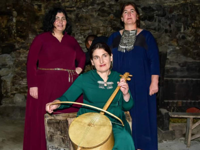 The Chamgeliani Sisters are a trio coming from a long lineage of singers from the mountainous and isolated province of Svaneti. Singing their ancestor’s songs, which are believed to be thousands of years old, and accompanied by the chuniri (three-stringed spike fiddle), the sisters bring, together with the Didgori Ensemble, a unique take on myths and Georgian folklore of