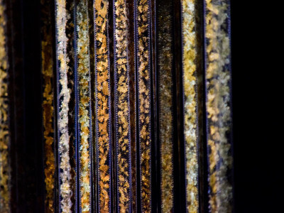 Working directly on celluloid with fine sheets of gold, she has created a monumental structure that allows viewers to see the effects of the material as it passes through a 35mm projector. The result is a spectacular mise-en-scène in which experimental musician Wade Matthews performs a live improvisation. Martos’ own body and gestures also play an essential role, transforming the relationship between the artwork, the projection space — in this case, the majestic church of Kunsthal Gent — and the audience, who are invited to move freely and experience the work from multiple perspectives.